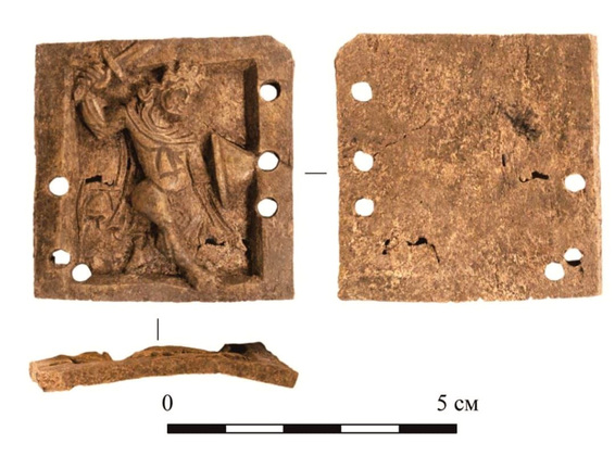 Накладка была обнаружена в небольшом раскопе площадью чуть более 70 кв. м, в границах которого археологи частично исследовали две усадьбы XII–XIV веков. Она представляет собой костяную квадратную пластину 45 х 46 мм, толщиной до 4 мм, в центре которой вырезано изображение воина в плаще. Воин показан в момент атаки, в левой руке он держит щит, в правой - занесенный для удара меч. Изображение выполнено очень искусно. Тонкие и проработанные детали: складки плаща, рельеф мышц воина, распущенные волосы - все это говорит о мастерстве резчика.