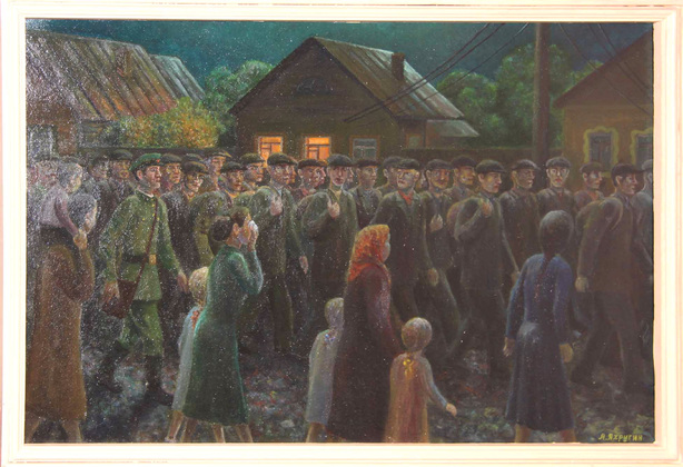 Одна из картин называется «Июнь 1941 г. Александровцы из Владимирской области уходят на войну защищать СССР, дом и семью». Мимо зрителя маршируют колонны мужчин-ополченцев с суровыми лицами, на переднем плане – заплаканные женщины и как будто съежившиеся, понурые дети.