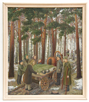 Еще один местный художник знает о войне не понаслышке. К ее началу Анатолию Ивановичу Яхругину только исполнилось пять, а Победу он встретил 9-летним, рано повзрослевшим мальчиком. Произведения А.И. Яхругина наделены чувством особого восприятия мира. Они своеобразны во всем, начиная с непривычно многословных, по-детски «обстоятельных» названий. Его творчество специалисты относят к наивному стилю, но именно благодаря этому военное время мы видим сегодня глазами ребенка, которым он и был на тот момент.