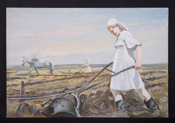 Второй рисунок автор назвал «Непобедимость. Возрождение». Используя сцену пахоты как аллегорию, он показывает, как русская земля оживает, очищается от вражеского присутствия. Заменившие мужчин женщины-пахари убирают с земли-кормилицы фашистские каски, осколки снарядов. Белые одежды символизируют чистоту и жертвенность.