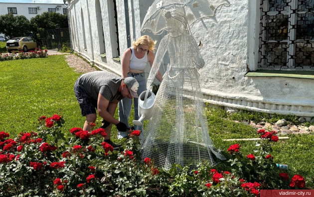 Администрация города сообщает о новой скульптуре, которая украсила газон у Георгиевского храма. Девушка словно поливает клумбу. Скульптура выполнена из ажурной металлической проволоки.