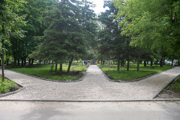 Начинаем с Зерновского сквера, расположенного у дома по улице Добросельской, 205. Поблизости - конечная остановка троллейбуса №1 и муниципальный театр «Разгуляй». В центре сквера памятник ветеранам подразделений особого риска, а к нему сходятся дорожки аллей, которые уже обрамлены новыми бордюрами. Рабочие при нас завершали укладку пескоцементной смеси под плитку.