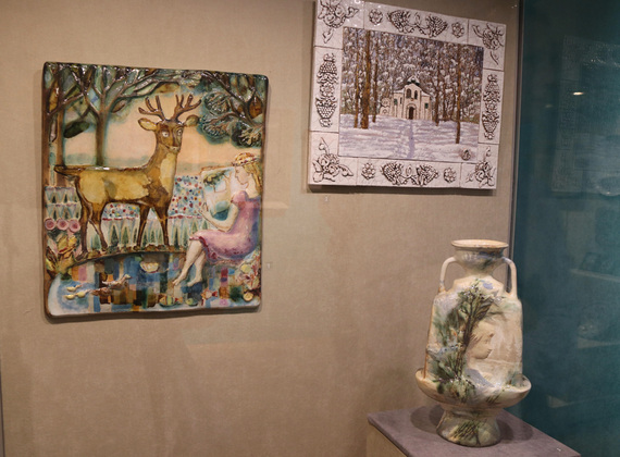 В 1885 г. руководить столярно-резчицкой мастерской стала Елена Дмитриевна Поленова. Она разрабатывала в русском стиле мебель и предметы быта, украшенные резьбой и росписью. Подвесные шкафчики, ящичек для рукоделия, стул – яркие примеры влияния народных традиций на профессиональное искусство. Эти образчики тоже увидят посетители выставки. Есть раздел, знакомящий с работой абрамцевской гончарной мастерской. Он – о М.Врубеле и П.Ваулине, очень много сделавших для развития русской майолики (изделия из цветной обожжённой глины, покрытые непрозрачной глазурью).