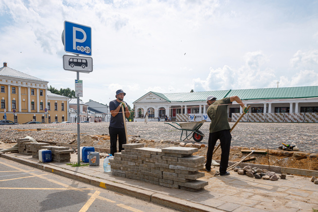 Пространство вокруг Торговых рядов продолжает меняться. Мейчас ремонтники занимаются мощением деревянной смотровой площадки и устройством натурального покрытия каменный ковёр, сообщила Алиса Михайловна.