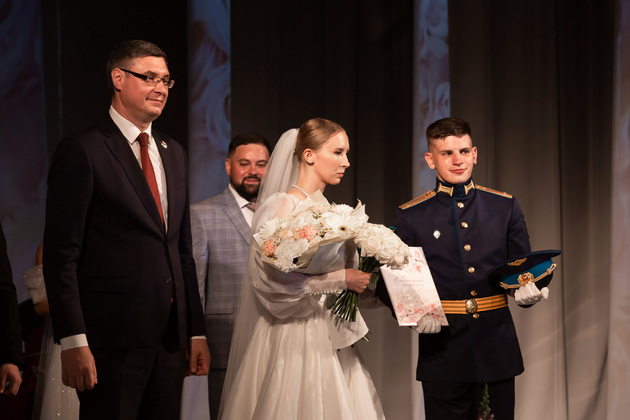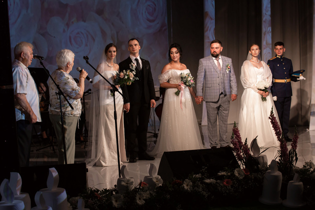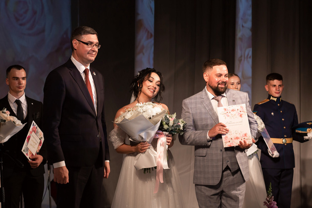 Напутствие молодоженам дала супружеская пара Виктора Васильевича и Валентины Ивановны Прокуроровых, отметивших 55-летие счастливого брака. Их история началась со школьной скамьи. Они воспитали двух дочерей, у них четыре внука.
