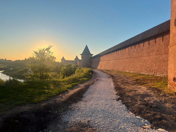 На западной стороне Спасо-Евфимиева монастыря подготовлено основание под укладку георастра на всем протяжении монастырской стены, на дорожках вдоль реки.