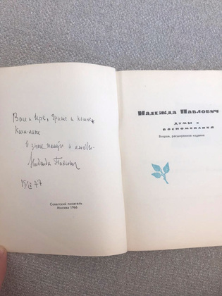 «На днях мне позвонила Ирина Васильевна и поделилась интересной находкой. Дело в том, что ее сын уже очень долгое время, практически постоянно, живет в США. Она решила, что будет уместно рассказать ему об известных людях, встречи с которыми Ирине Васильевне подарила жизнь, и которые дарили ей что-то на память. В числе таких людей была и Надежда Александровна Павлович, писательница-поэтесса и женщина удивительной судьбы… Перебирая архив, Ирина Васильевна увидела небольшой сборник под названием «Думы и воспоминания» с дарственной надписью от автора. Перелистывая страницы книги, она нашла стихотворение, посвященное Александровской слободе, и тут же мне позвонила, за что я безмерно ей благодарна…».