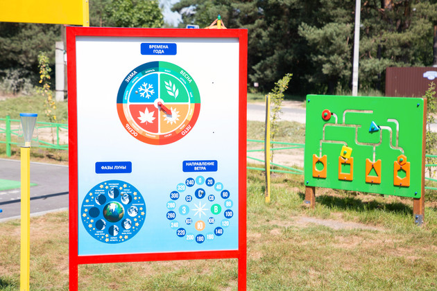 Для деток постарше на площадке предусмотрена «метеостанция», это как раз и есть тот самый научный компонент. С помощью специального ветроуказателя ребята могут определять направление ветра; анемометр показывает скорость ветра. В арсенале «метеостанции» - солнечные часы, флюгер, термометр, а также стенды с занимательной инфографикой, «рассказывающей» о видах облаков, о фазах Луны, о временах года и связанных с ними атмосферных явлениях.