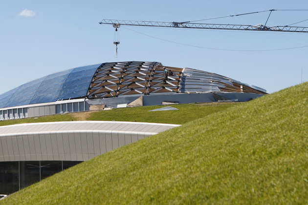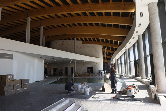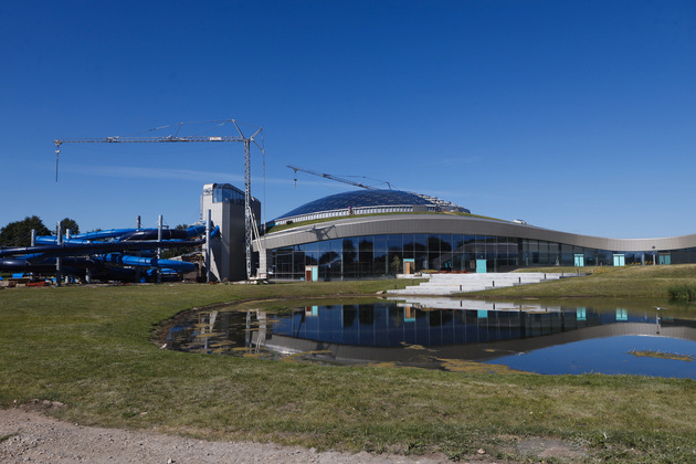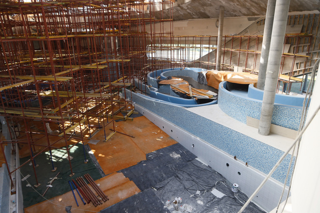 На стройке подъемный кран, словно огромный циркуль, возвышается над аквапарком. Высота крана - с пятиэтажный дом. Повсюду трудятся рабочие - в общей сложности задействовано 60 специалистов. Сейчас идет остекление большого купола, который венчает центральный бассейн. В дневное время тут будет естественное освещение.