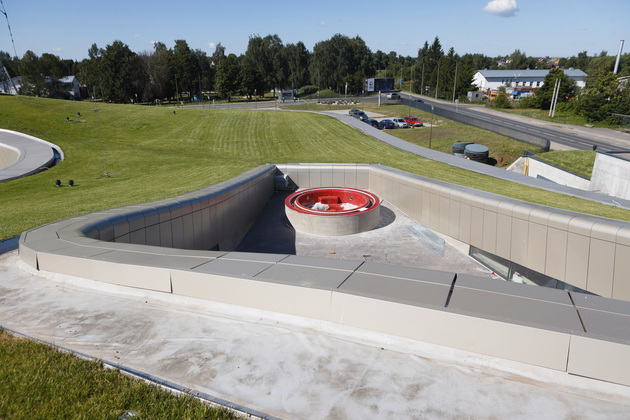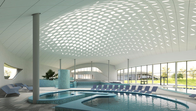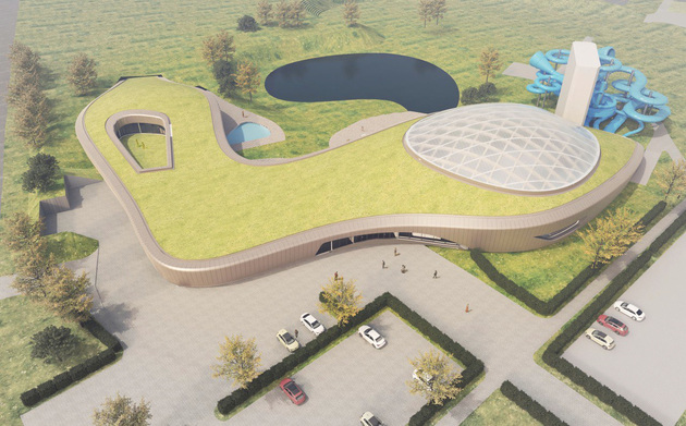 Архитектура аквапарка, который располагается на территории ГТК «Суздаль», будто самой природой вписана в ландшафт древнего Суздаля. Плавные, округлые линии крыши с естественным травяным покрытием создают ощущение, что аквапарк разместился внутри крепостного вала. Это впечатление усиливается, когда находишься на крыше.