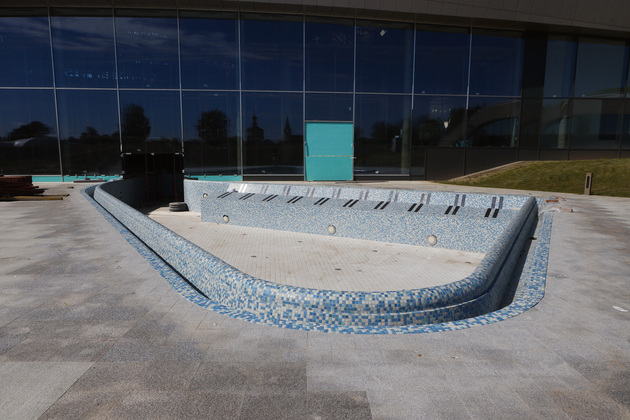Затем мы перешли в сектор бассейнов. Всего их в большом зале пять: глубина - метр тридцать сантиметров, по периметру - подсветка. Здесь будут участки с гидро- и аэромассажем. Некоторые бассейны с более теплой водой, а некоторые - с водой похолоднее. Кому что нравится. Предусмотрена также имитация волн. Специальная установка генерирует движение волны на поверхности.