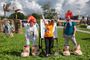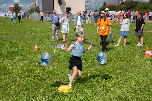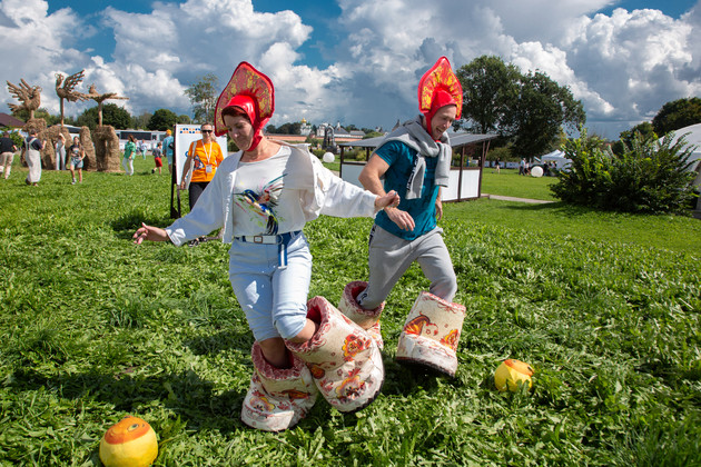 Можно было поиграть в кёрлинг, где вместо снаряда - корзина с капустой, или сразиться в конкурсе на меткость попадания мячом в корзину, сделать забег с коромыслом, посоревноваться в дальности метания букетов с колосьями и много еще в чем.