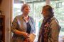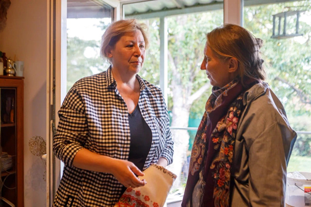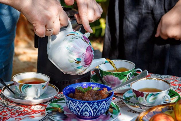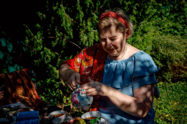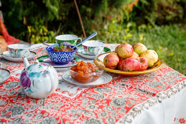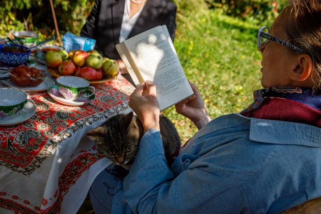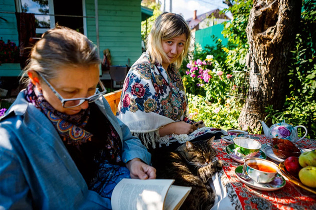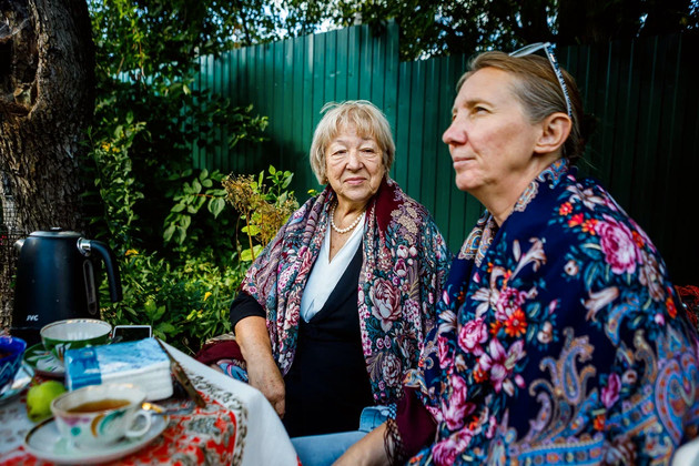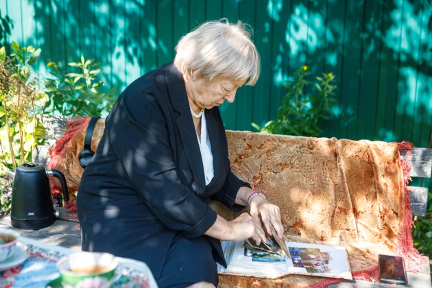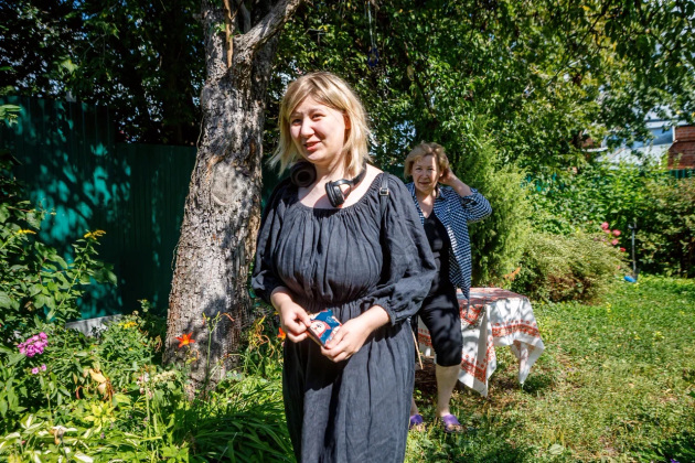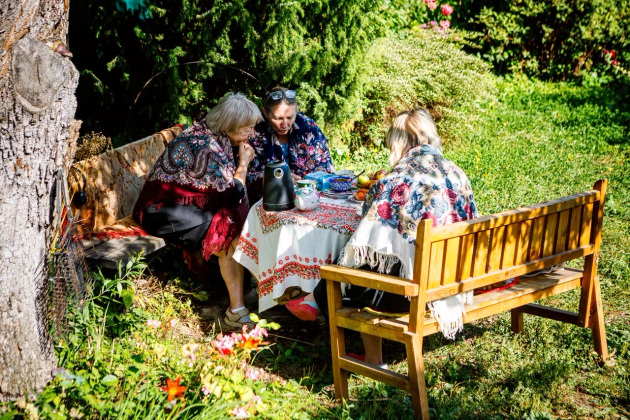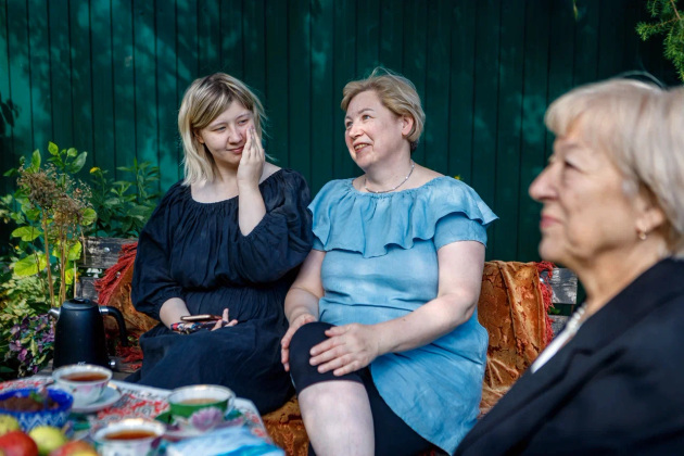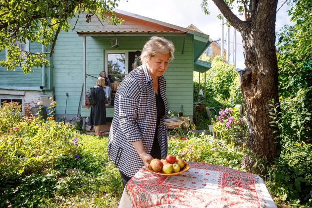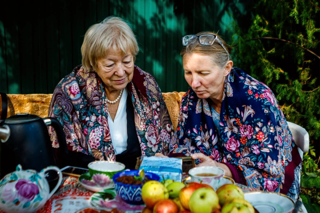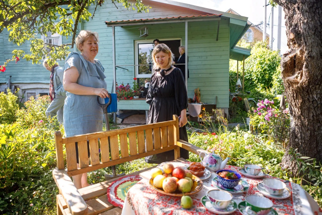 Визит журналистов - тоже, можно сказать, гостевой прием. Хозяева накрыли стол прямо в саду под грушей - чай, яблочное варенье и, конечно же, свежие яблоки. Присоединились мама Елены Лариса Григорьевна, дочь Соня и Надежда.