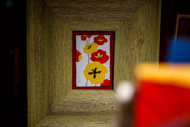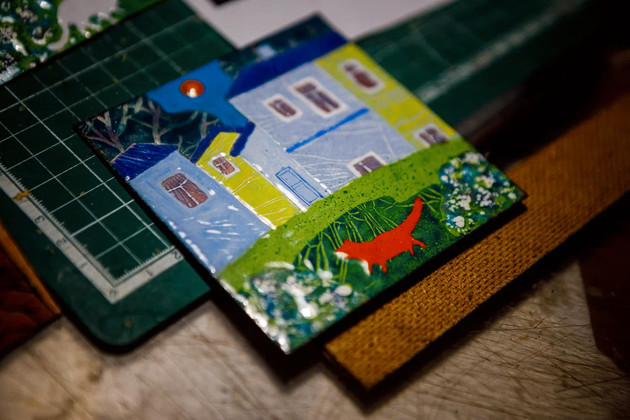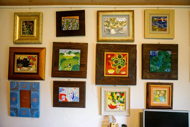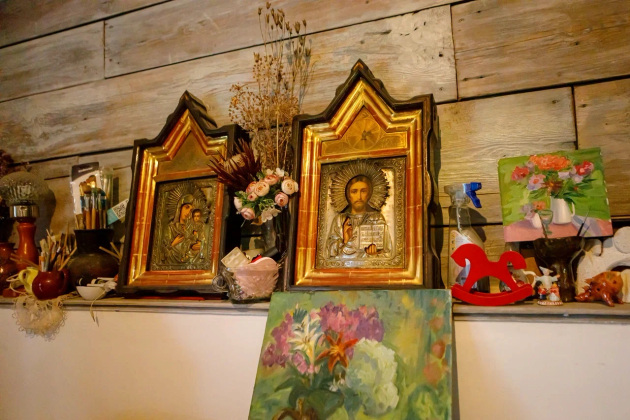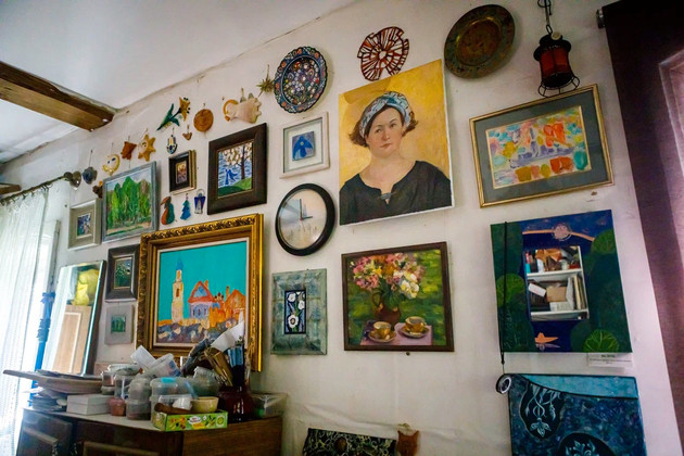 Часть работ художницы выставлена у нее дома. Тут и натюрморты с яблоками, и цветочные композиции, храмы, ангелы и святые лики, колоритные деревенские улочки, декоративные узоры, коты и сказочные персонажи.