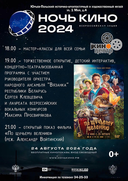 Центром проведения акции «Ночь кино» во Владимирской области станет Юрьев-Польский историко-архитектурный и художественный музей. Там на открытой площадке, среди великолепных памятников русской архитектуры, областной Киноцентр организует основные мероприятия (0+).