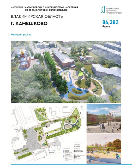 Обновление: проект благоустройства площади в городе Камешково под названием «Мелодия рожка» также стал победителем конкурса. Теперь город получит средства из федерального бюджета на его реализацию.