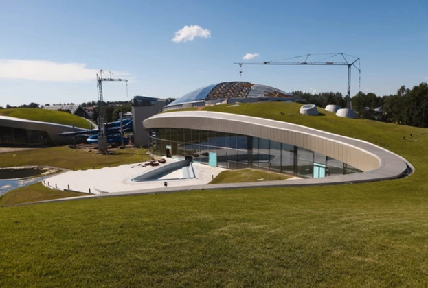 Вообще вся архитектура аквапарка очень гармонично вписана в ландшафт древнего Суздаля. А под слоем кровельного газона - современное пространство со всеми инженерными коммуникациями. Самая зрелищная часть - стеклянный купол - собирался вручную.