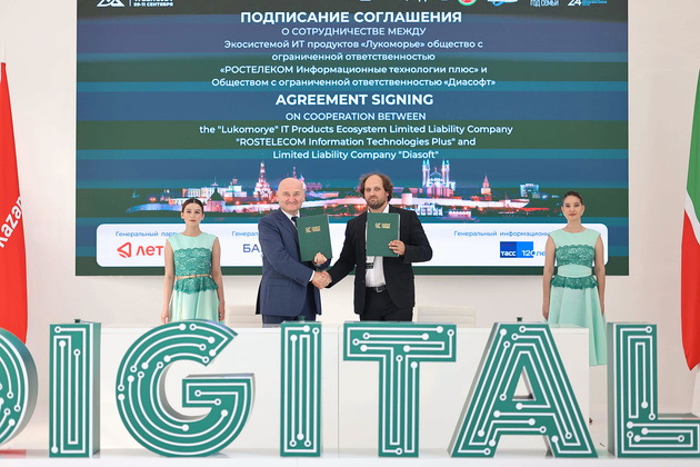 Документ о сотрудничестве на площадке Kazan Digital Week подписали генеральный директор «РТК ИТ Плюс», руководитель линейки продуктов «Лукоморье» Арсен Благов и член совета директоров «Диасофт» Александр Генцис.