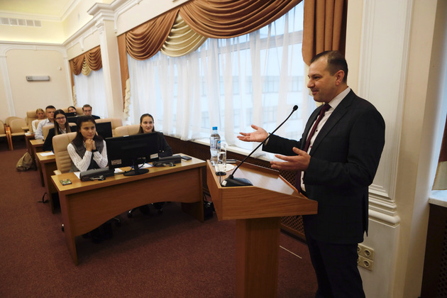 На вводном занятии лектором для ребят выступил вице-спикер Роман Кавинов. Он рассказал о конституционных основах устройства законодательной ветви власти в России и Законодательном Собрании на современном этапе.