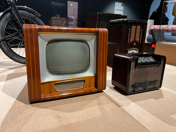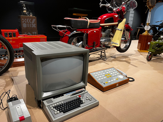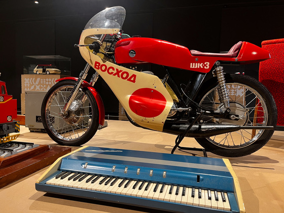 А по центру восстановлен интерьер почти любой советской квартиры, с креслами и музыкальными пластинками, проигрывателем "Гамма 8" муромского завода, мотоциклами "Восход", первым громоздким компьютером, а рядом - современные модные кресла "Асконы". Как пример нового дизайна, но в рамках старых традиций.