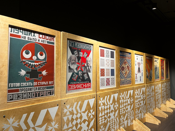 По периметру - современные и оригинальные образцы дизайна из столичного музея: Олимпийский сочинский факел образца 2014 года, макет гоночной машины "Маруся", граненый стакан с космической тематикой, книга графического дизайна и другие. Особое внимание - агитплакатам и слоганам прошлого столетия.