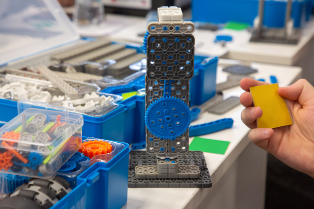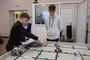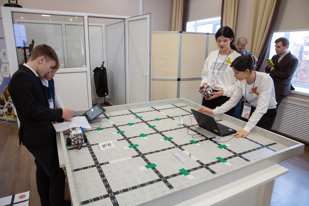 – Конкурс проходит на полигоне по нескольким дисциплинам. В «Роботе-чертежнике» на поле есть пять точек. Участникам нужно соединить круги фломастером с помощью робота. Суть дисциплины «Робот-доставщик»: нужно куб определенного цвета, например, красного, привести в коробку такого же цвета.