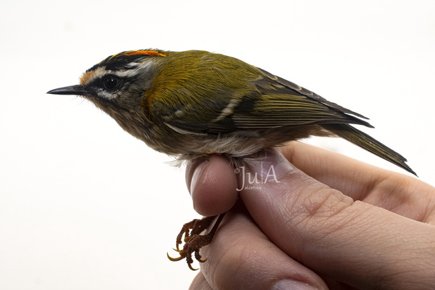 Красноголовый королек оказался молодым самцом. После процедуры кольцевания его выпустили там же, где и поймали.