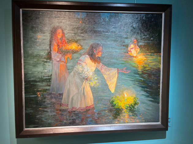 У Вадима Левахина представлены портреты и пейзажи. Темы затрагиваются мистические, обрядовые, например, полотно об опускании венков на Ивана Купалу, есть и отсылки к литературным произведениям, классическому кинематографу. Масляная живопись, темпера, гуашь, - живописец демонстрирует владение разными техниками.