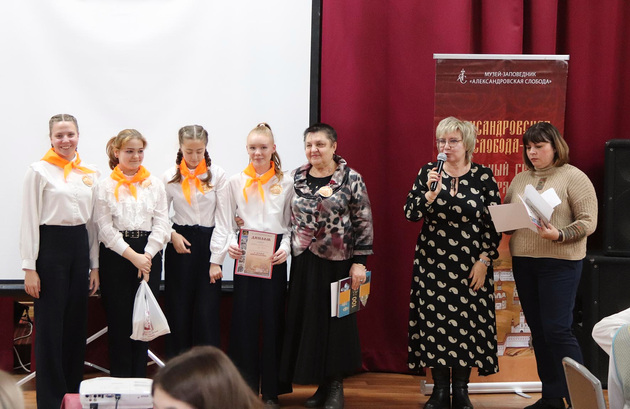 У старших набралось 8 команд (СОШ № 1, 2, 7, 8,10, 13,16). Названия тоже придумали «средневеково-печатные». В результате победила «Опричнина» (школа № 10, руководитель Н.А. Детистова), второе место поделили «Земщина» и «Сказители слободы Александровской», на третьем месте «Хранители знаний».