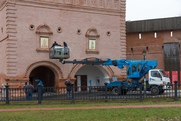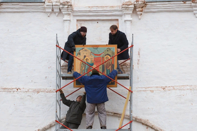 Почти год над их созданием трудились студенты и преподаватели Российской академии живописи, ваяния и зодчества Ильи Глазунова. Шесть икон заняли ниши на проездной башне и надвратной Благовещенской церкви. Они располагались там исторически, о чем свидетельствуют старые фотографии и иллюстрации.