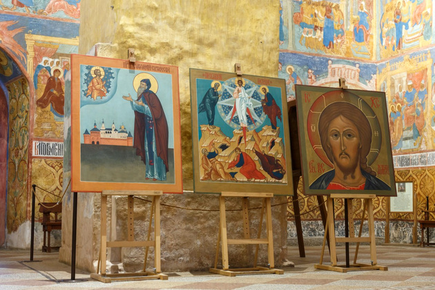 Иконы выполнены в технике силикатной живописи, отметила пресс-служба Владимиро-Суздальского музея-заповедника. Эта техника позволяет образам долгое время сохранять краски даже под открытым небом.