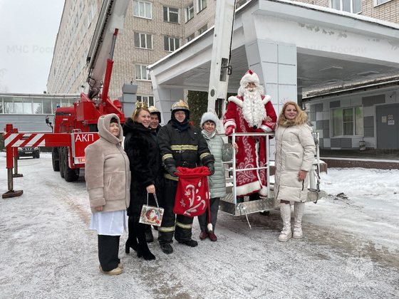В Коврове пожарные и спасатели подарили новогоднее чудо пациентам детского отделения городской больницы. Дед Мороз поднялся к ребятам на шестой этаж на автоколенчатом подъемнике и вручил каждому лично в руки сладкий подарок.
