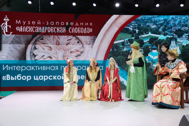 А месяцем позже там же, но уже в павильоне «Наша культура» музейщики приняли участие в первом дне Всероссийского Свадебного фестиваля. По приглашению Министерства культуры «слободчане» с успехом провели на сценической площадке форума «Выбор царской невесты» - интерактивную костюмированную реконструкцию с участием посетителей. Театрализованный фрагмент подлинной свадебной церемонии в Александровской слободе внес в программу фестиваля статусный царский шарм в формате веселого действа.