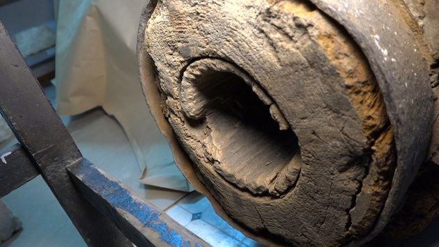 Водопроводная труба, бережно принесенная на днях в хранилище, была обнаружена в земле на территории царского кремля в 1970-х годах. В средние века они распространились повсеместно и вплоть до 1960-х годов встречались во многих городах России.