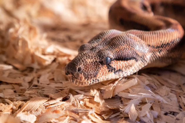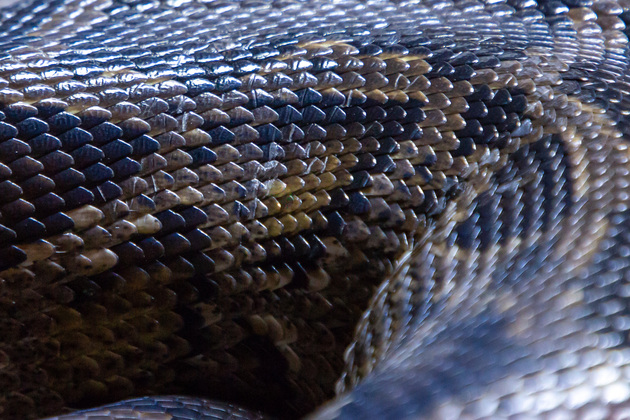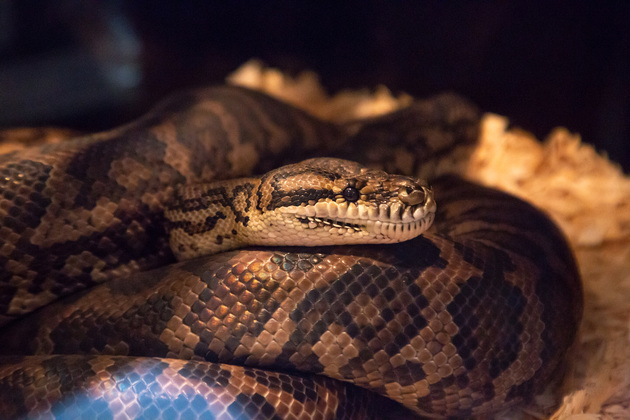 А по соседству живет сетчатый питон по имени Сетка. Змея украшена узором в виде ромбовидных пятен, что действительно похоже на сетку. Рацион питания и условия содержания примерно такие же, как и у его собрата. Сейчас змея спит.