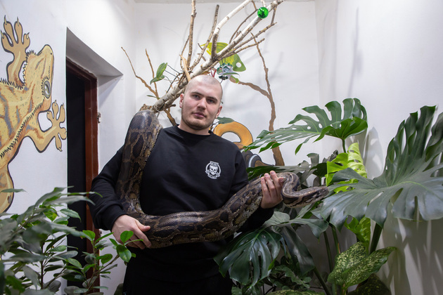 - Люди сразу же обращают внимание на тигрового и сетчатого питонов, - подводит меня к вольеру с питомцами Александр. - Это тигровый питон по имени Толя. (Для змеи выбор имени несколько неожиданный. - Прим. авт.) Анатолий - питон-отказник. Прежние хозяева, видимо, с ним «наигрались», стало тяжело держать. Так через знакомых он оказался у нас.