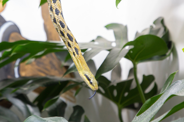 Он также рассказал, что в планах экзотариума - разведение ринхофиса Буланже, змеи из семейства ужеобразных. По-другому ее еще называют носатым полозом Буланже. Вид получил название в честь именитого бельгийско-британского биолога. Но почему полоз «носатый»? Достаточно на него посмотреть - и вопрос отпадет сам собой. Ринхофис имеет характерный вырост на голове, напоминающий «нос». Только это вовсе не орган для обоняния, а сросшиеся щитки-чешуйки. Взрослые особи этой змеи имеют ярко-зеленый окрас. Такой необычный облик и вырост на голове помогают животным лучше маскироваться в горных лесах Южного Китая и Северного Вьетнама, где они обитают.
