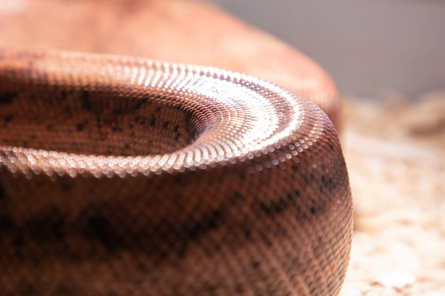 Толя проявил слабый интерес к гостям. Поднял голову, присмотрелся и снова прилег отдохнуть. При этом глаза-пуговки не моргают, взгляд неподвижен и кажется гипнотическим. А всё потому, что у змей сросшиеся веки, которые образуют защитную пленку. Иными словами, эти животные не умеют моргать - их глаза всегда открыты. Из-за этой физиологической особенности им нередко приписывают такие качества, как гипноз и коварство. Вспомните ветхозаветного змея-искусителя, который предложил Еве запретный плод!