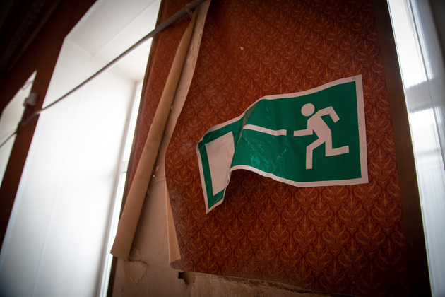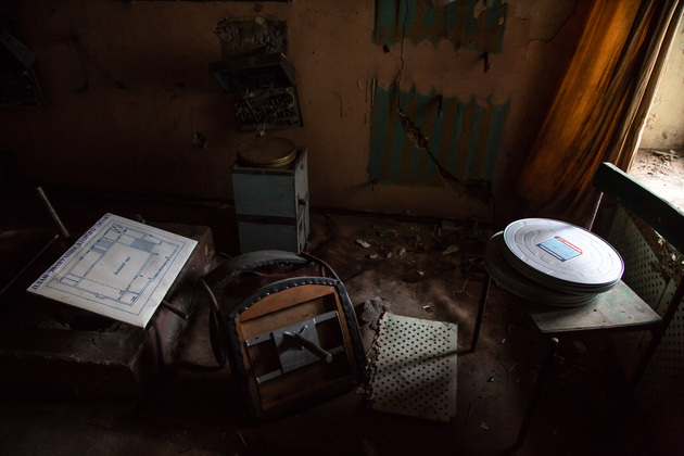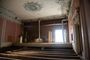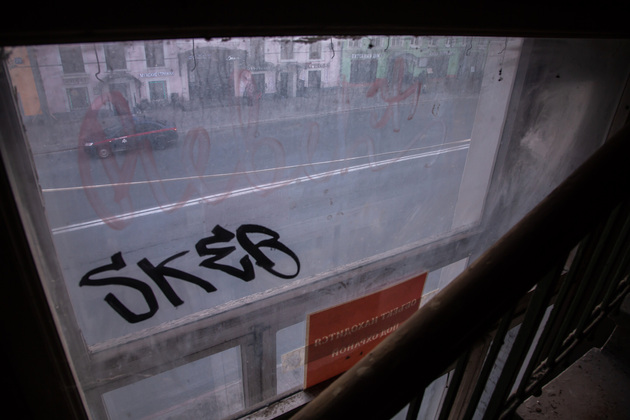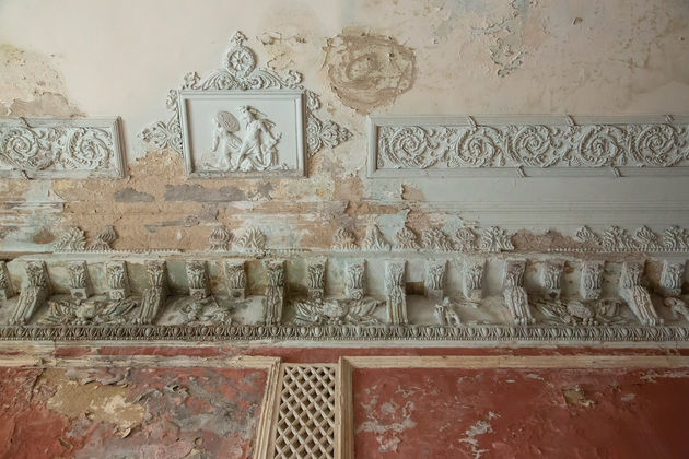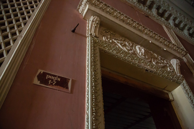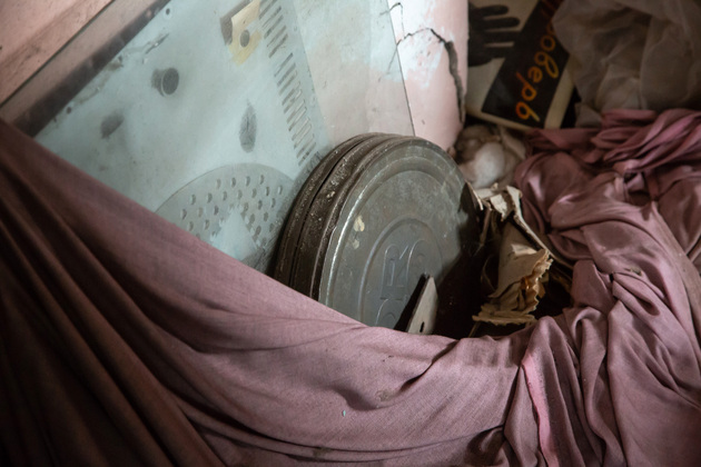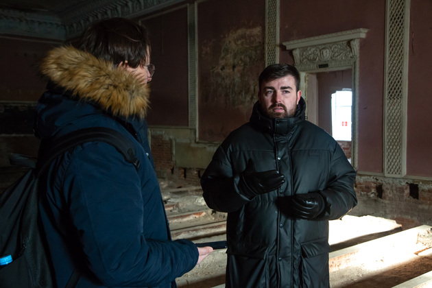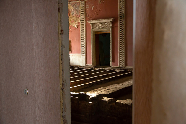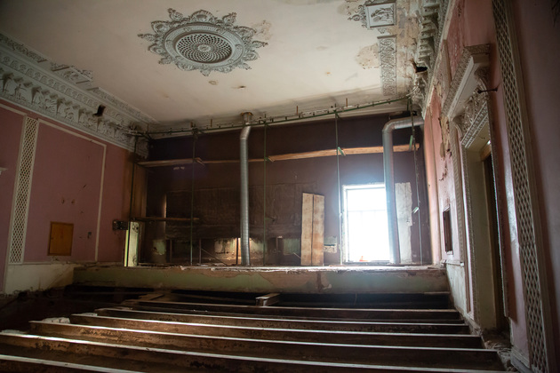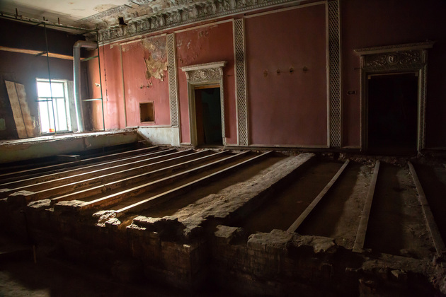 В сопровождении Дмитрия Родина захожу внутрь «Художки» - и ахаю. Бывший кинотеатр не узнать. В большом зале - оголенные напольные лаги, ни кресел, ни проекционного экрана. Правда, на стенах и потолке сохранилась историческая лепнина советских годов. В здании нет отопления и отключено электричество, работает только охранная сигнализация, поэтому приходится пользоваться фонариком мобильного телефона.