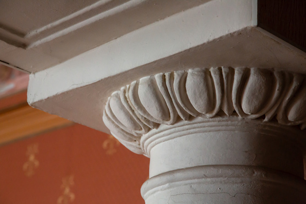 Мы также побывали в фойе левого крыла, где предусмотрена организация зоны отдыха. В этом помещении сохранились колонны и лепнина. Все эти интерьерные элементы, по уверению Дмитрия, обязательно восстановят.