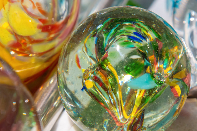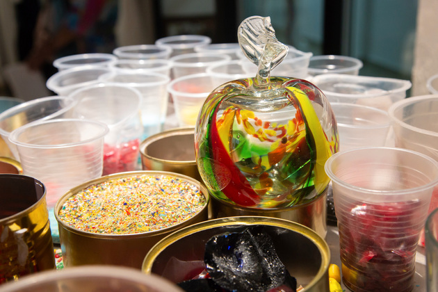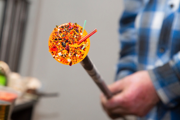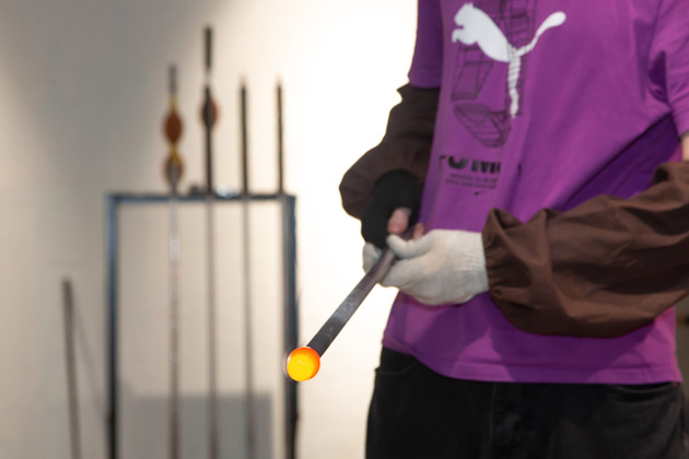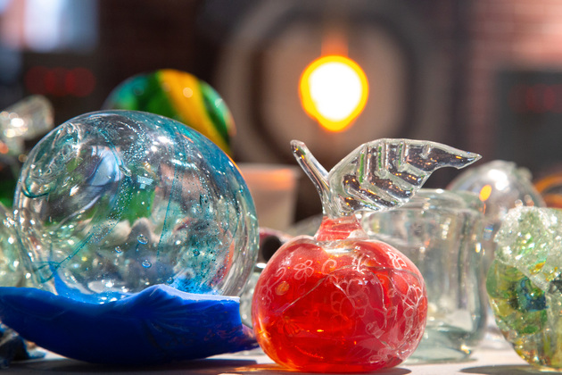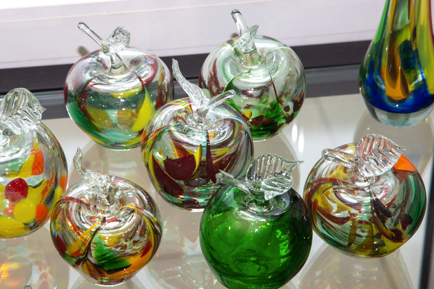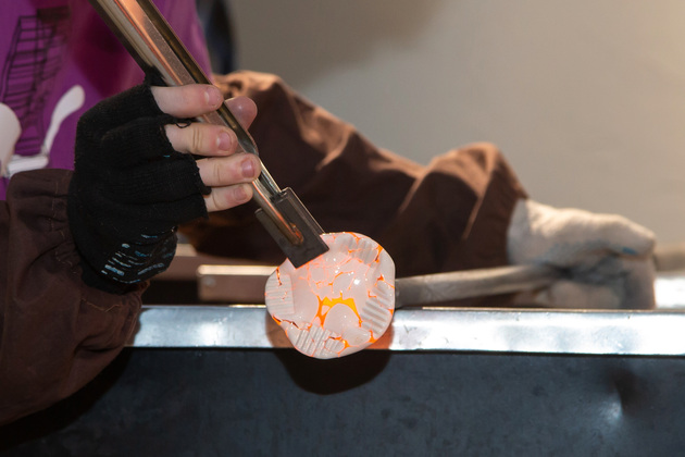 Мастер Дубровин показал студентам процесс изготовления таких изделий. На этот раз он решил сделать выдувное яблоко, причем цветное. Привычным движением трубки выполнил набор стекломассы, макнул ее в осколки цветного стекла и снова поместил шарик в печь, чтобы они расплавились и окрасили заготовку.