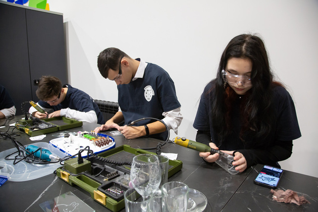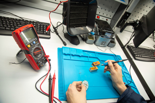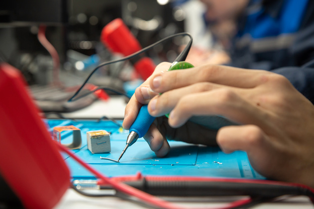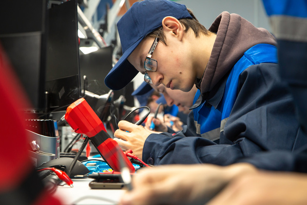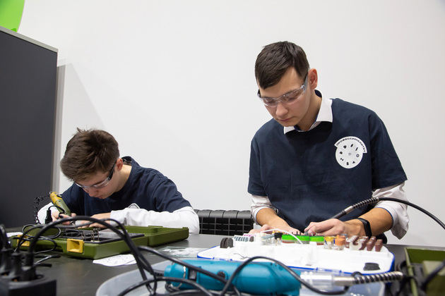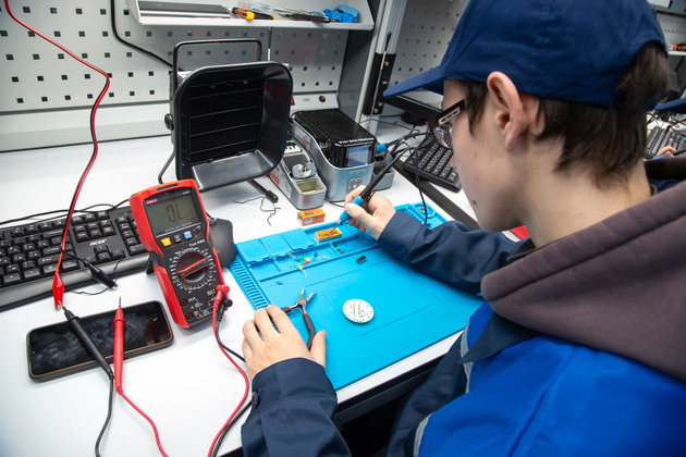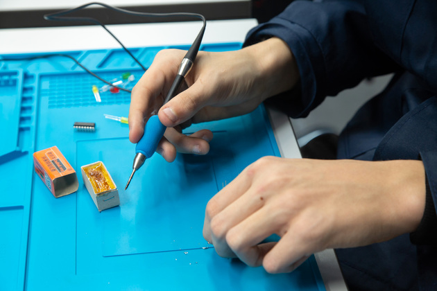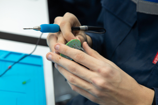 Сегодня студенты выполняют практическое занятие по сборке электронной платы. Работа филигранная! С помощью цифрового микроскопа можно посмотреть, насколько качественно проведена пайка платы, затем снять показания, используя осциллограф. Кроме того, будущих специалистов обучают разработке и компьютерному моделированию электронных плат. А затем их даже можно изготовить на специальном лазерном станке.