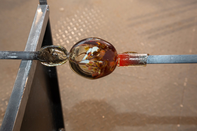 Каждое движение мастера выверено, и со стороны кажется, что делать яблоко проще простого. Как бы не так! Набор горячего стекла необходимо еще непрерывно вращать. Этот материал крайне пластичный - почти как жидкий мёд. А сколько необходимо знать нюансов и подводных камней! За легкостью движений мастера - десятилетия практики.