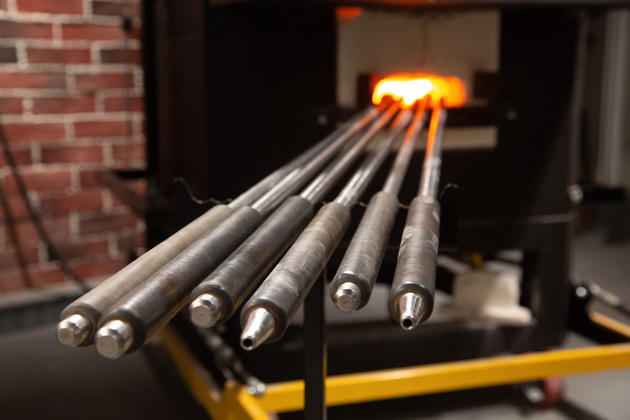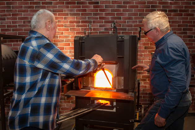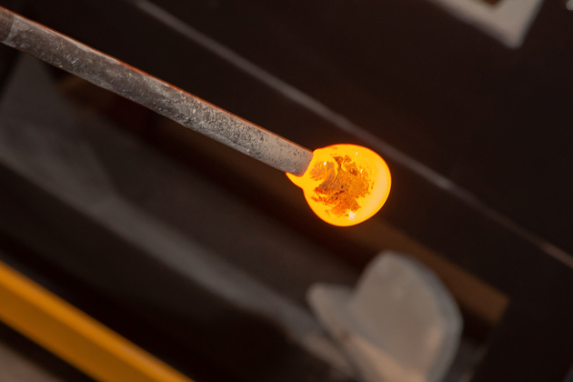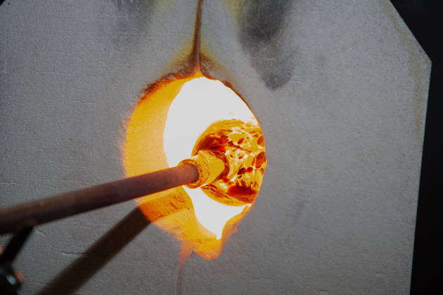 К процессу подключается его коллега - выдувальщик Сергей Дубровин, мастер стекольного производства с полувековым стажем. Сергей Анатольевич берет наборную трубку и, непрерывно вращая ее, запускает в жерло печи, в стекломассу. На конец трубки наматывается раскаленное пластичное стекло, образуя небольшой шарик.