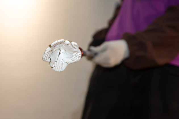 Александр признался, что ему больше нравится лепить из раскаленного стекла. Он показал, как освоил ремесло, и буквально минут за пятнадцать сваял цветок.