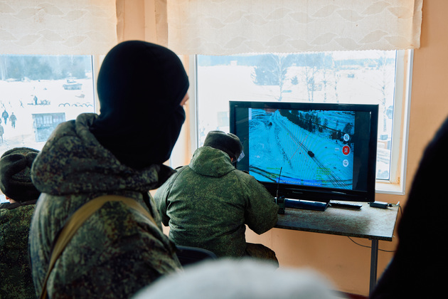 На командном пункте руководитель вождения осуществляет общий объективный контроль при помощи БПЛА. На экране мы увидели, как обучаемый механик-водитель БМП преодолевает препятствие с максимально возможной скоростью.