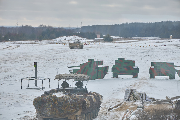 Командир роты указал рукой влево и отметил, что там проводится 14-е базовое упражнение армейской тактической стрельбы. Солдаты не только поражают движущиеся мишени, но и ведут огонь из различных положений: стоя, сидя, лежа, из-за укрытий и из окон.