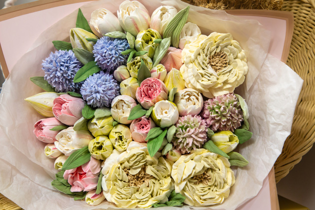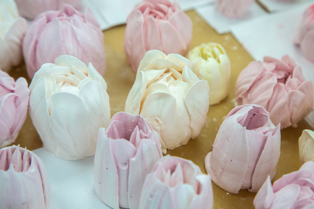 Как вам съедобные цветочные букеты из зефира? С виду цветы как будто живые! На самом деле они изготовлены на основе яблочного пюре с применением безопасных пищевых красителей. Или, например, корпусные пирожные в виде груши, банана или других экзотических фруктов; десерты, имитирующие фастфуд. Здесь делают также макарон - это такое французское пирожное из яичных белков, сахара и молотого миндаля с фруктовым наполнителем. И это лишь малая часть всевозможных лакомств.