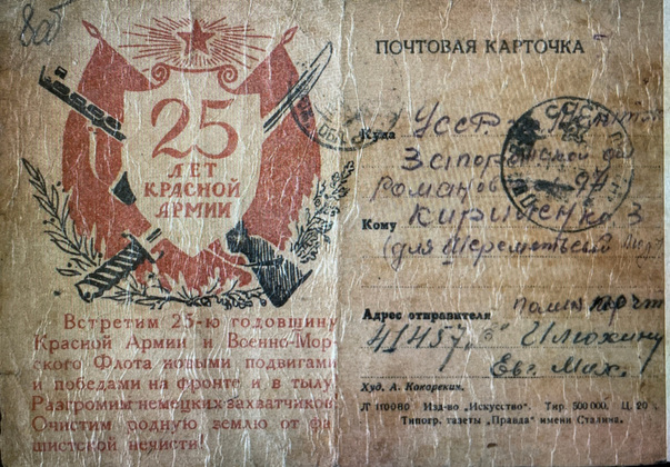 20 апреля 1944 г. Привет с фронта! Молдавия. <…> Люда! Сегодня, т.е. 20.4.44, совсем неожиданно получил от тебя письмо, почему я пишу неожиданно, потому что я из Грозного не ожидал, т.к. я уже послал письмо в г. Мелитополь. Когда я получил письмо, считал, что там есть фото, оказалось, что его нет. Но это я прощаю, потому что буду ожидать из родного твоего города Мелитополя. Людочка! Поверь, как скучно проходят минуты, часы и дни в ожидании хотя какой-нибудь весточки, но все не было и не было и вот совсем неожиданно получаю ее. Люда! Как видишь, все продвижение и продвижение, времени свободного совсем мало, зато пришлось побывать в своих советских городах, в Николаеве и Одессе, и сейчас продолжаем продвигаться дальше на запад, освобождая шаг за шагом каждый метр советской земли.