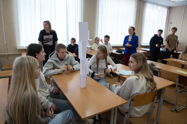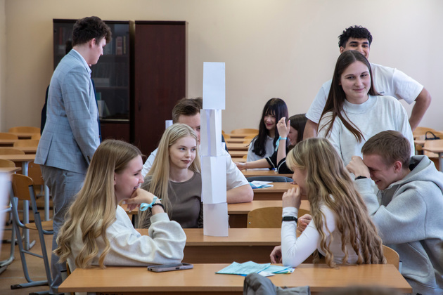 Затем активные студенты-волонтеры помогли одиннадцатиклассникам, распределенным на группы, пройти через серию увлекательных занятий с преподавателями института.